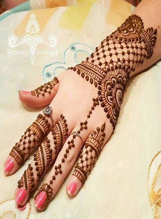 The mathematical examples in this plan on the hand are evergreen. The checkered example in the middle and the round examples stretching out from them loan a tasteful look to the plan. The plan is brimming with striking strokes and different mathematical examples. A portion of the blueprints are obscured to give it an otherworldly and cleaned look. This plan can be enhanced during favorable celebrations like Teej, Diwali, Dussehra and so forth