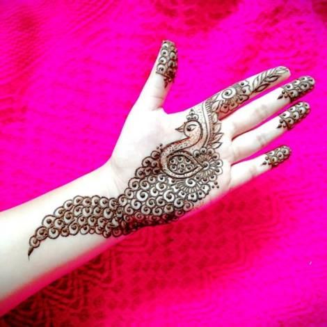 This basic yet rich plan includes a petite peacock in the middle. The perplexing specifying inside the peacock and the dim intense diagrams feature the peacock in the focal point of the palm. The checkered example adjoining it is trimmed with little hearts and looks exceptionally charming. The regard for enumerating is astonishing in the concealed piece of the plan. Every fingertip has an alternate plan and adds an exceptional touch. Since peacocks represent ripeness and satisfaction, it tends to be decorated during weddings and infant showers. It tends to be combined up with an incredible lehenga or a sharara.