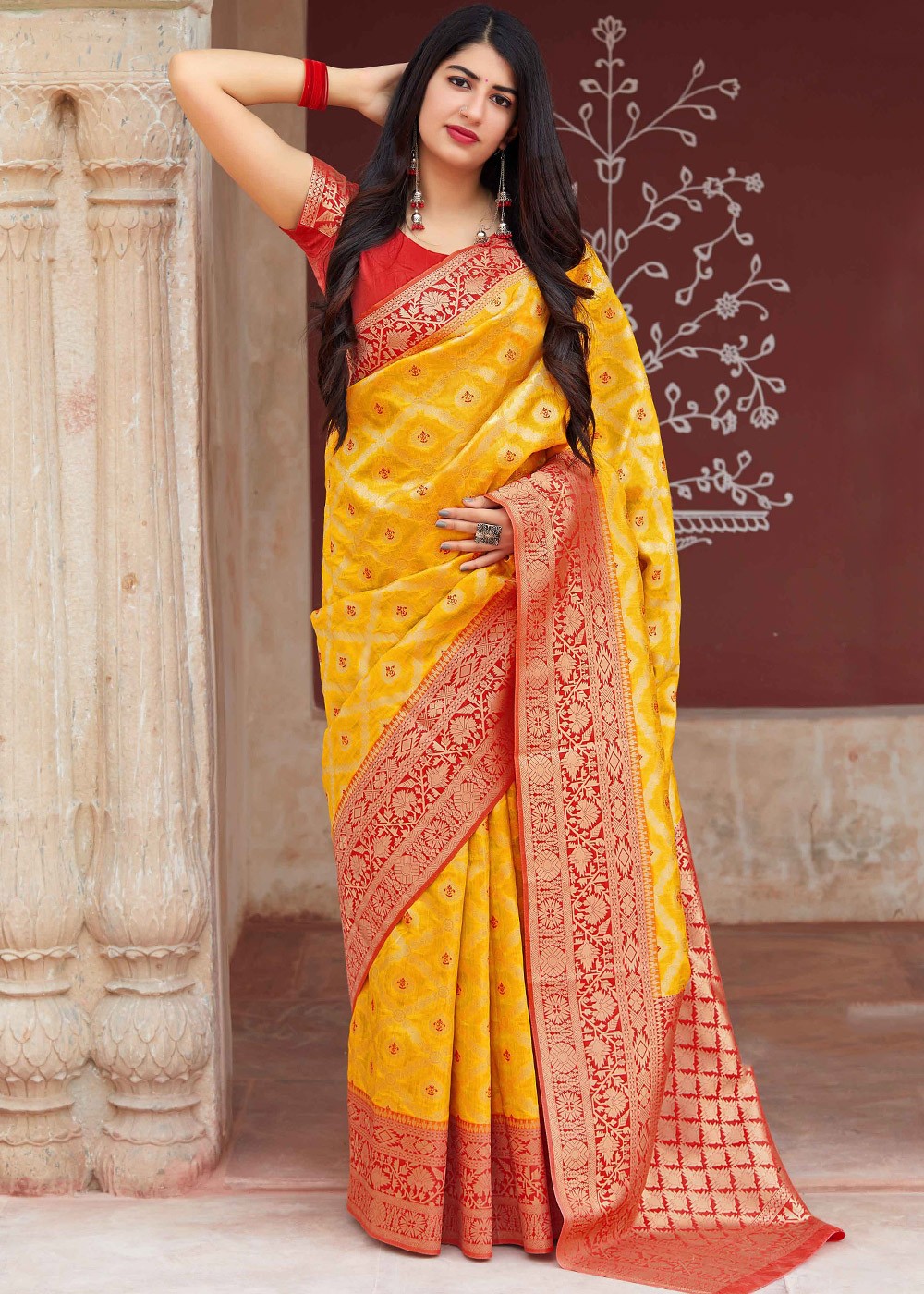 The timeless yellow and red combination of banarasi sarees cannot be overlooked when discussing traditional sarees for Bengalis. This dress has long been a favourite among brides and is still popular today.
