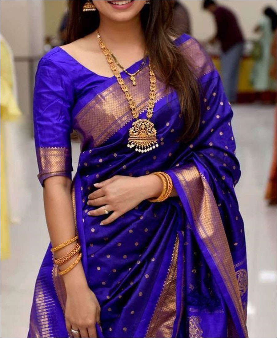 It not only has a distinctive appearance, but also will draw attention because to its sparkle and vibrant colours. For newlyweds, brides, and future brides, this classic saree will dazzle everyone in your vicinity. Additionally, you can dress up your look by wearing them at auspicious pujas.