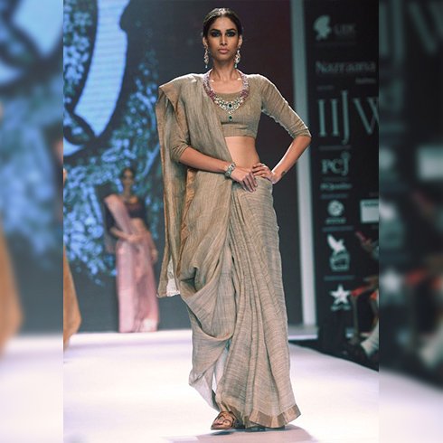 Take the pallu from back to the front and after that tuck it over the shoulder to finish your look. Disregard not that your fresh jeans are the feature of the look.